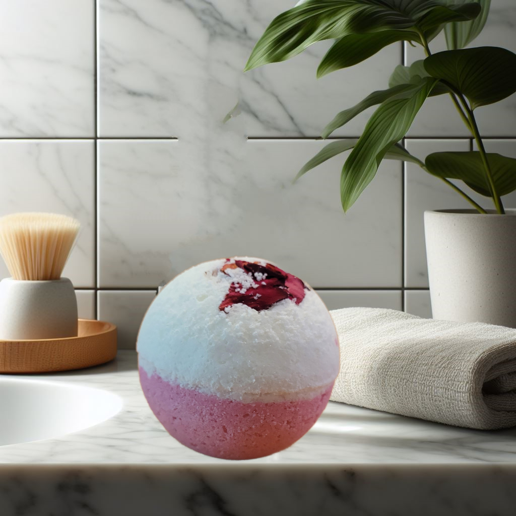 Ingrédients: Bicarbonate de soude, Acide citrique, Sel Epsom, fécule de mais, eau , alcool , coco bétaïne , Polysorbate 80, Mica,, huile essentielle de rose, colorant, fleurs de rose séchées.