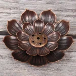 Un petit brûleur d’encens en métal, conçu avec un motif de fleur de lotus, adapté à une utilisation dans les temples bouddhistes, les studios de yoga et comme objet décoratif pour l’encens chinois.